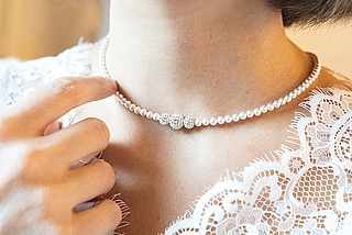 Diese luxuriöse Halskette stammt aus dem Hause ”Laue Festgarderobe” in Tellingstedt und kann wunderbar mit Kleidern oder Blusen kombiniert werden, und natürlich ist sie auch für ein Brautkleid perfekt geeignet.